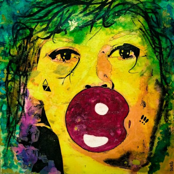 Technique et matériaux : Technique Mixte collage / aquarelle, papier de soie, feuille d’or, posca, résine
