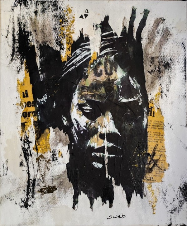 Technique et matériaux : Technique Mixte collage / Déchirage / Paris Match d’origine / Aquarelle / Papier de soie / Paillette / Fusain / Charbon / Feuille d’or / Posca