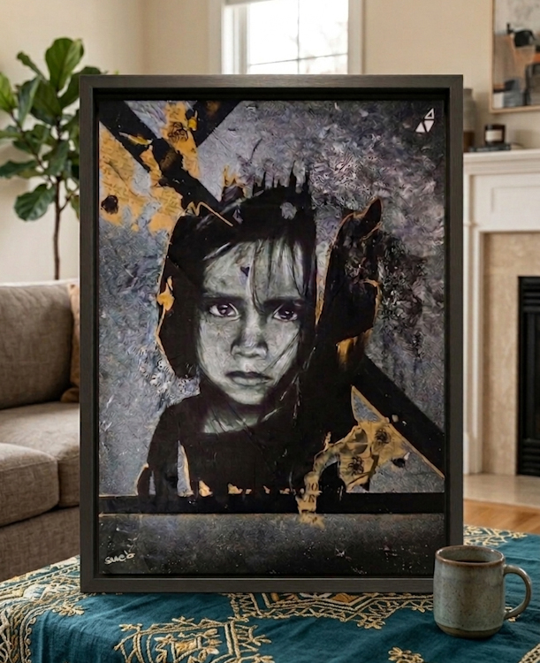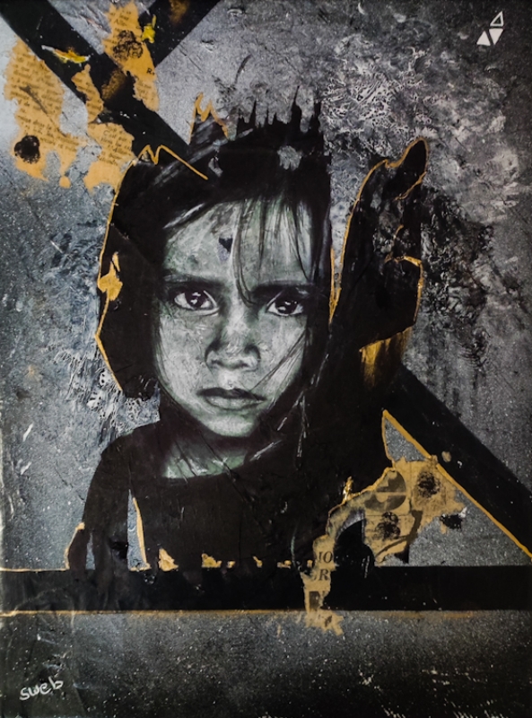 Technique et matériaux : Technique Mixte collage / Déchirage / Paris Match d’origine / Aquarelle / Papier de soie / Paillette / Fusain / Charbon / Feuille d’or / Posca