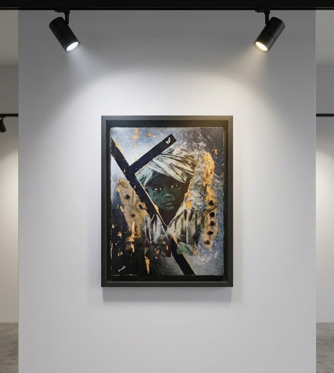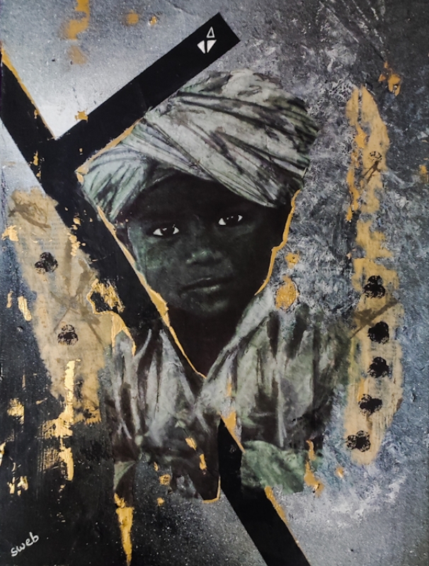 Technique et matériaux : Technique Mixte collage / Déchirage / Paris Match d’origine / Aquarelle / Papier de soie / Paillette / Fusain / Charbon / Feuille d’or / Posca