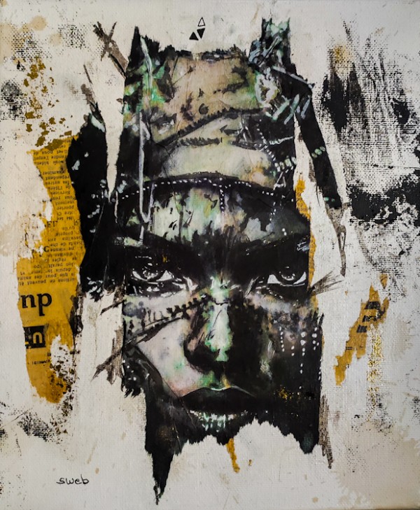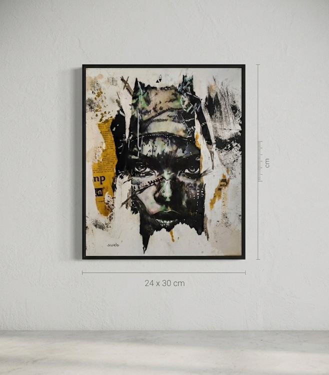 Technique et matériaux : Technique Mixte collage / Déchirage / Paris Match d’origine / Aquarelle / Papier de soie / Paillette / Fusain / Charbon / Feuille d’or / Posca