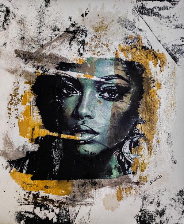 Technique et matériaux : Technique Mixte collage / Déchirage / Paris Match d’origine / Aquarelle / Papier de soie / Paillette / Fusain / Charbon / Feuille d’or / Posca