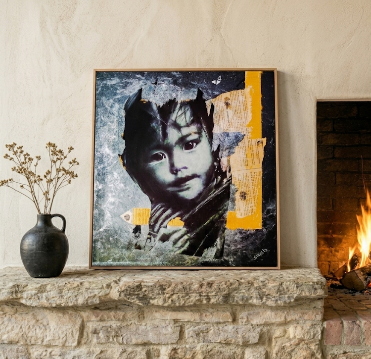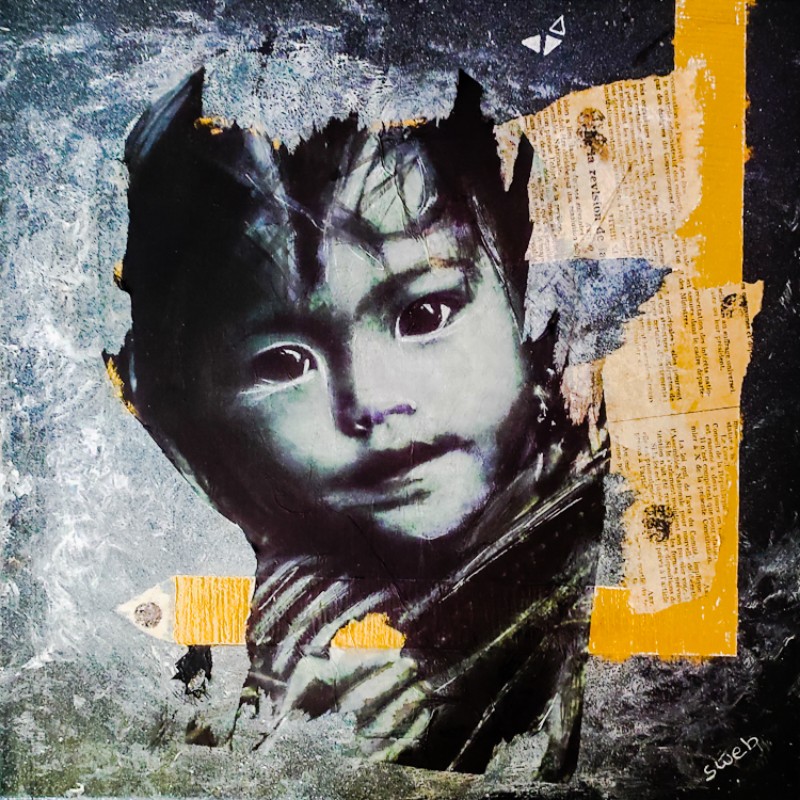 Technique et matériaux : Technique Mixte collage / Déchirage / Paris Match d’origine / Aquarelle / Papier de soie / Paillette / Fusain / Charbon / Feuille d’or / Posca