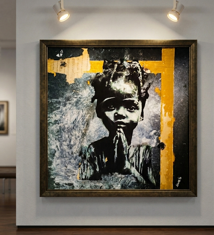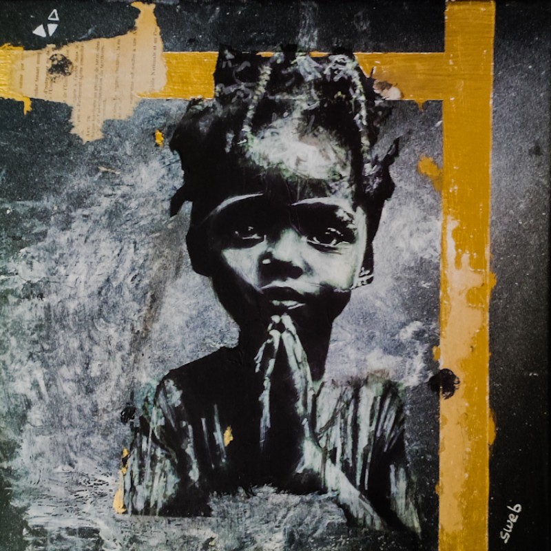 Technique et matériaux : Technique Mixte collage / Déchirage / Paris Match d’origine / Aquarelle / Papier de soie / Paillette / Fusain / Charbon / Feuille d’or / Posca